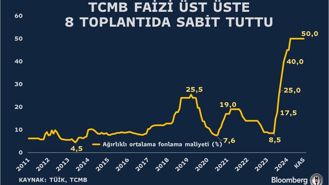 Türkiye Cumhuriyet Merkez Bankası (TCMB) politika faizini 8. kez sabit tuttu. Banka politika faizini yüzde 50 seviyesinde bıraktı. Karar metninde Ekim ayında enflasyonun ana eğiliminde düşüş gözlendiği tespit edildi. TCMB enflasyon üzerindeki yukarı yönlü risklere karşı ihtiyatlı duruşunu yineledi. Karar metniyle piyasalar gevşeme sinyali alırken, bankacılık endeksinde yüzde 5'i aşan prim kaydedildi.