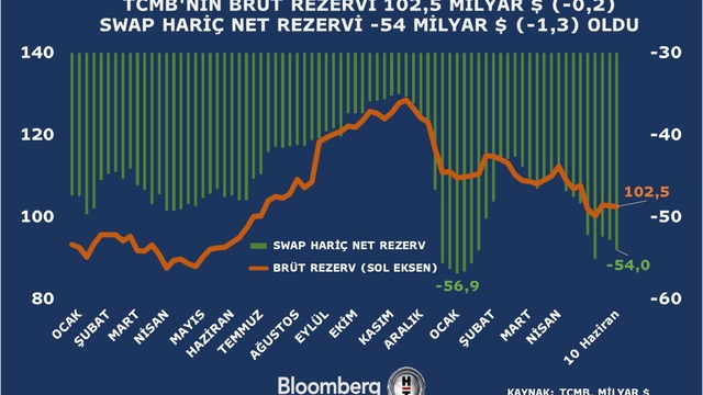 Swap hariç net rezerv aynı haftada eksi 54 milyar dolara geldi. Bir önceki hafta bu veri eksi 52,8 milyar dolar olmuştu.