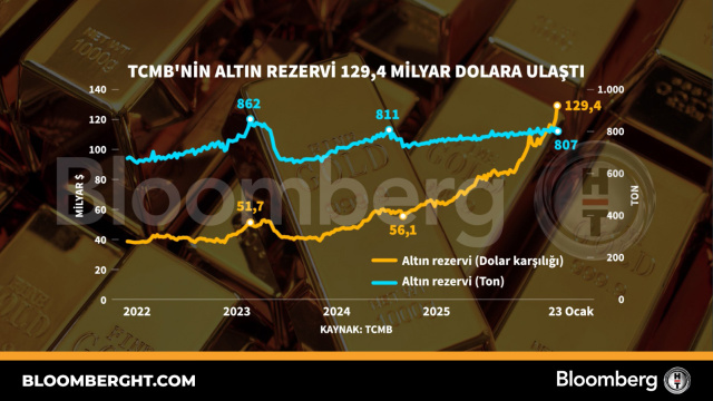 Bloomberg HT Grafik TCMB'nin altın rezervi 129,4 milyar dolara ulaştı TCMB'nin altın rezervi 129,4 milyar dolara ulaştı 29 Ocak 2026, 17:40 Güncelleme : 29 Ocak 2026, 17:40