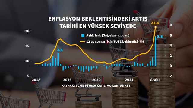 Türkiye Cumhuriyet Merkez Bankası'nın reel sektör ve finansal sektör temsilcileri ve profesyonelleri ile yaptığı aralık ayı Piyasa Katılımcıları Anketi'nde 12 ay sonrası enflasyon beklentisi yüzde 21,39 oldu. Kasım ayında bu beklenti yüzde 15,61 olarak kaydedilmişti. Aradaki fark veri setinin en yüksek farkı olarak gerçekleşti.