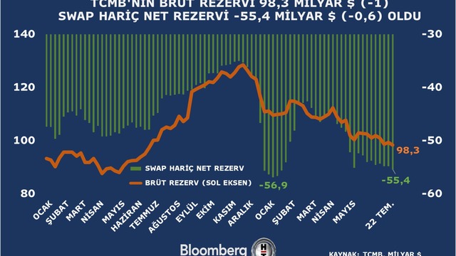 TCMB verilerine göre 22 Temmuz haftası itibariyle brüt rezervler 98,3 milyar dolar oldu. Böylelikle Haziran 2021'den bu yana en düşük seviye kaydedildi. Bir önceki hafta brüt rezervler 99,4 milyar dolar olmuştu.