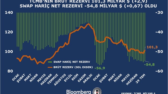 Swaplar hariç net rezervlerde de toparlanma görüldü. Buna göre 29 Temmuz haftasında swap hariç net rezerv eksi 54,8 milyar dolar oldu. Bir önceki hafta bu veri eksi 55,4 milyar dolar olarak gerçekleşmişti.
