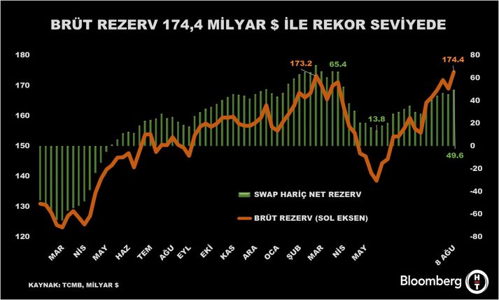 TCMB verilerine göre brüt rezervler 8 Ağustos haftasında 174,4 milyar dolara yükseldi. Bir önceki hafta brüt rezervler 169 milyar dolar seviyesindeydi.