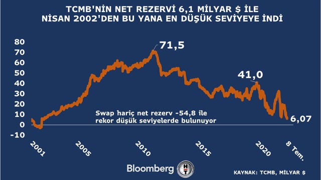 Türkiye Cumhuriyet Merkez Bankası (TCMB) net rezervi 8 Temmuz haftasında 6,1 milyar dolara geriledi. Böylelikle net rezervlerde Nisan 2002'den bu yana en düşük seviye izlendi. Brüt rezervler de 100 milyar doların altına geriledi.