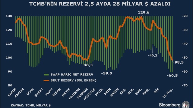 TCMB verilerine göre brüt rezervler 26 Mayıs haftasında 3,1 milyar dolar düşüşle 98,5 milyar dolara geriledi. Son verilerle birlikte TCMB'nin brüt rezervlerinde 2,5 ayda 28 milyar dolarlık düşüş izlendi.