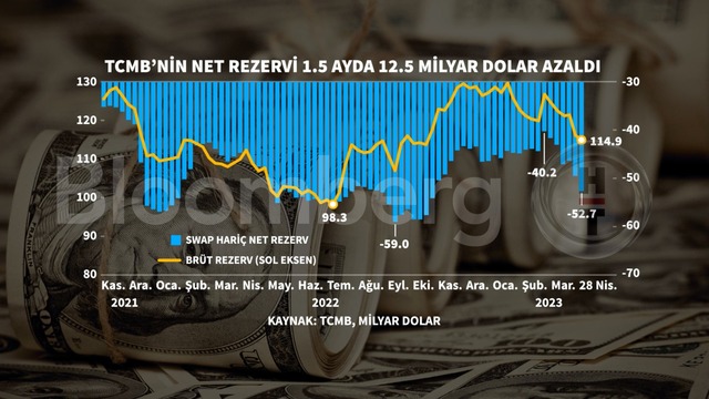 Geçen hafta swap hariç net rezervlerde de bozulma izlendi. TCMB verilerinden yapılan hesaplamaya göre swap hariç net rezervler 28 Nisan haftasında eksi 52,7 milyar dolar oldu. Bir önceki hafta swap hariç net rezervler eksi 49,5 milyar dolar olarak gerçekleşmişti.