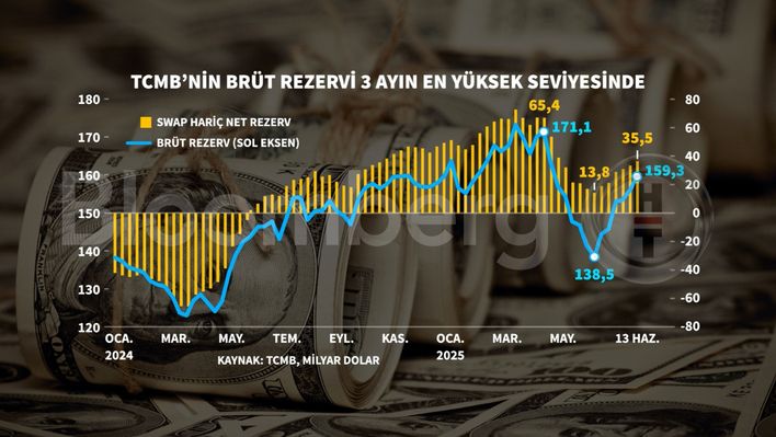 TCMB verilerine göre brüt rezervler 159,3 milyar dolar seviyesine çıktı. Önceki hafta brüt rezervler 155,9 milyar dolar düzeyindeydi.