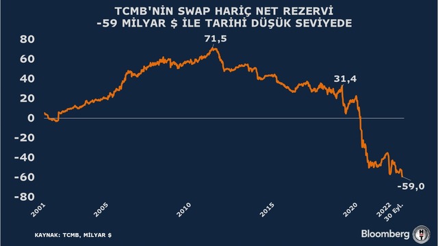 Verilere göre 30 Eylül haftası itibariyle swap hariç net rezervler eksi 59 milyar dolar oldu. Bir önceki hafta bu rezervler eksi 55,4 milyar dolar olarak kaydedilmişti.