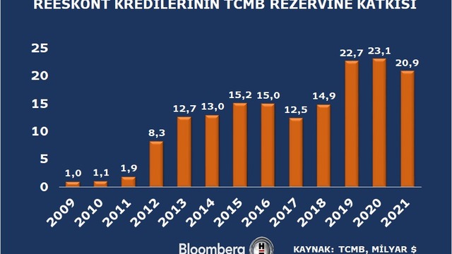 Reeskont kredileri TCMB rezervlerine katkı sunan kalemlerden biri olarak öne çıkıyor. Reeskont kredilerinin rezerv katkısı 2012'den bu yana yükseliş eğilimi içinde olurken, 2020'de 23,1 milyar dolara yükselmişti.