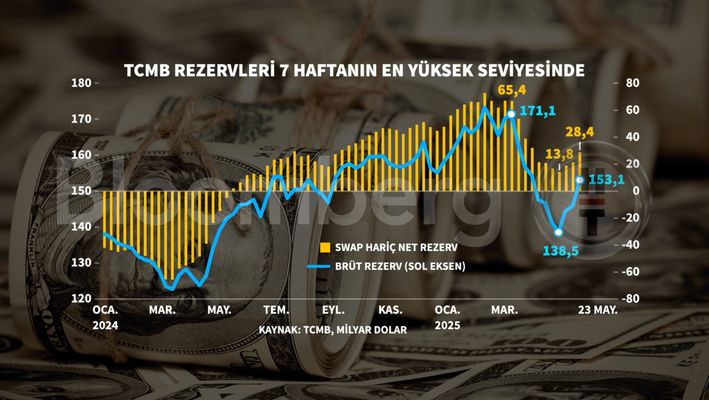 Böylece Merkez Bankasının toplam rezervleri, 23 Mayıs haftasında bir önceki haftaya göre 7 milyar 453 milyon dolar artışla 145 milyar 657 milyon dolardan 153 milyar 110 milyon dolara çıktı.