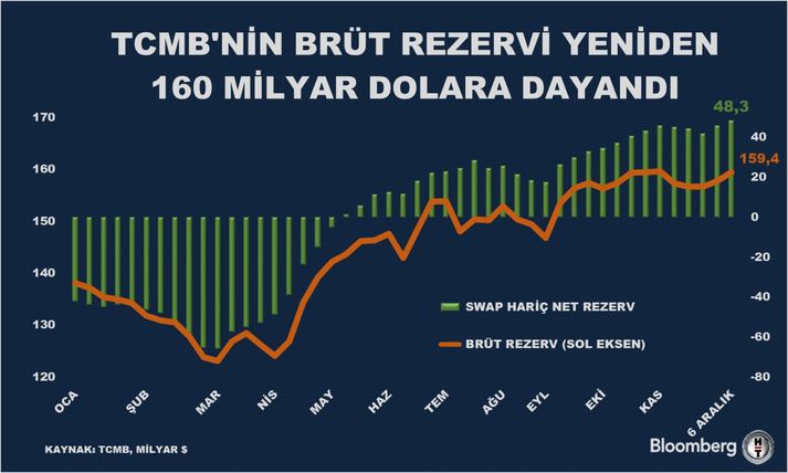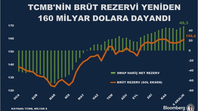 Türkiye Cumhuriyet Merkez Bankası (TCMB) verilerine göre 6 Aralık haftasında brüt rezervler 159,4 milyar dolarla önceki rekor seviyelere geldi.