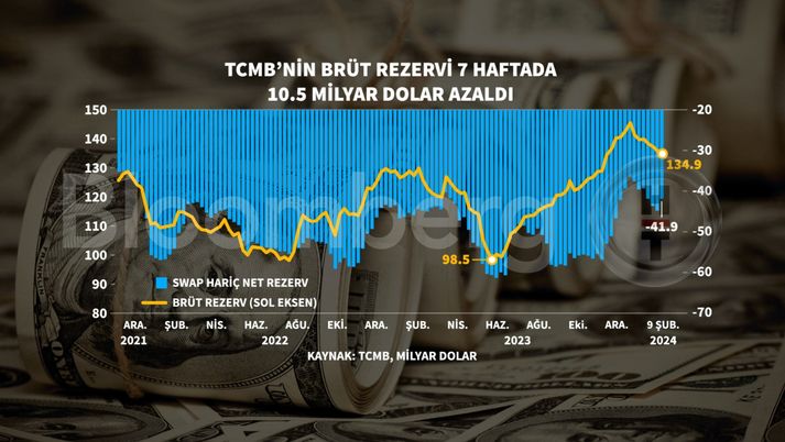 Türkiye Cumhuriyet Merkez Bankası'nın (TCMB) verilerine göre brüt rezervler 9 Şubat haftasında 134,9 milyar dolara geriledi. Bir önceki hafta brüt rezervler 135,4 milyar dolar seviyesindeydi.