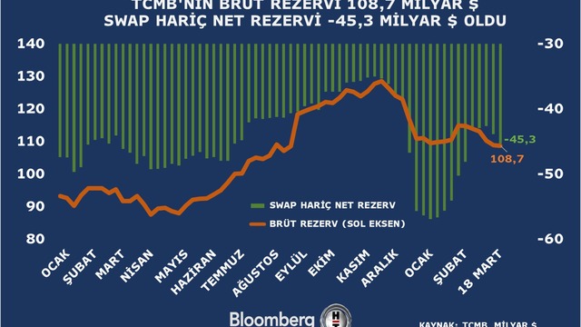 Buna karşın swap hariç net rezervlerdeki bir önceki hafta başlayan bozulmanın devam ettiği izlendi. 18 Mart haftasında swap hariç net rezervler eksi 43,9 milyar dolardan eksi 45,3 milyar dolara çıktı.