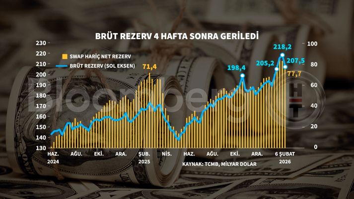 TCMB verilerine göre brüt rezervler 6 Şubat haftasında 207,5 milyar dolara geriledi. Bir önceki hafta brüt rezervler 218,2 milyar dolarla rekor seviyeyi görmüştü.