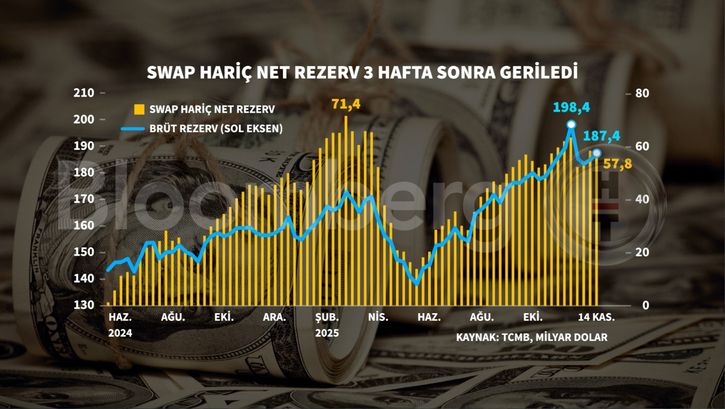 Buna karşılık, net rezervler 73,3 milyar dolardan 72,2 milyar dolara ve swap hariç net rezervler ise 58,4 milyar dolardan 57,8 milyar dolara geriledi.