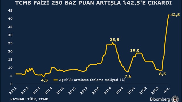 Türkiye Cumhuriyet Merkez Bankası (TCMB) yılın son Para Politikası Kurulu (PPK) toplantısında politika faizini beklentilere paralel şekilde artırırken, parasal sıkılaştırma adımlarını "en kısa zamanda" tamamlamayı planladığı mesajını verdi. PPK bir haftalık repo faizini 250 baz puan artışla yüzde 42,50'ye çıkardı. Bloomberg HT anketine katılan 27 ekonomistin neredeyse tamamı da faizin bu seviyeye yükselmesini bekliyordu.