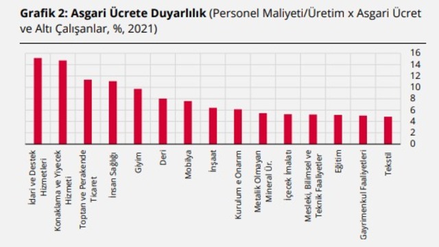 Asgari ücretli payı ile personel maliyetinin üretim değeri içindeki payı birlikte değerlendirildiğinde ise asgari ücret artışına en duyarlı sektörlerin idari-destek hizmetleri, lokanta-otel, toptan-perakende ticaret, insan sağlığı, giyim, mobilya, inşaat ve bakım-onarım gibi sektörler.