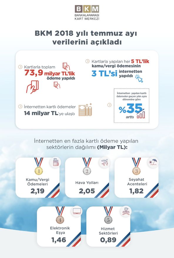 Temmuz ayı içinde yapılan internetten kartlı ödemelerin sektörel dağılımı incelendiğinde ise 2.19 milyar TL ve yüzde 16 pay ile kamu/vergi ödemeleri, 2.05 milyar TL ve yüzde 15 pay ile hava yolları sektörleri internetten en fazla kartlı ödeme yapılan sektörler oldu. 1.82 milyar TL ve yüzde 13 pay ile seyahat acenteleri, 1.46 milyar TL ve yüzde 11 pay ile elektronik eşya, 0.89 milyar TL ve yüzde 6 pay ile hizmet sektörleri de internetten en fazla kartlı ödeme yapılan sektörler arasında yer aldı.