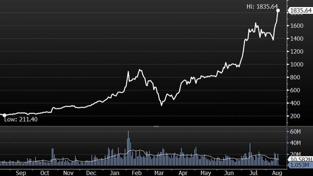 ABD merkezli elektrikli otomobil üreticisinin hisseleri, dünkü işlemlerde yüzde 11.2 yükselerek 1,845.86 dolar ile tüm zamanların en yüksek gün içi seviyesini gördü. Sonrasında 1,835.64 dolardan kapattı.