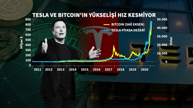Tesla’nın 1,5 milyar dolarlık Bitcoin yatırımından sonra kripto paranın değeri 48 bin dolar seviyesini aşarak tüm zamanların en yüksek seviyesine ulaştı. Tesla aynı zamanda müşterilerine Bitcoin ile araba satın alma imkânı sağlayacaklarını söyledi.