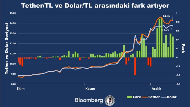 Dolara endeksli sabit koin Tether'in TL değeriyle dolar/TL kuru arasındaki makas dikkat çekiyor. Kripto para borsalarında işlem gören Tether/TL ile dolar/TL arasındaki fark Aralık başında yükseldikten sonra haftaiçi de kapanmayarak 50 kuruşa kadar çıktı. 10 Aralık cuma günü sabah saatlerinde Dolar/TL 13,85 seviyesinde işlem görürken Tether/TL 14,37 seviyesini test etti.