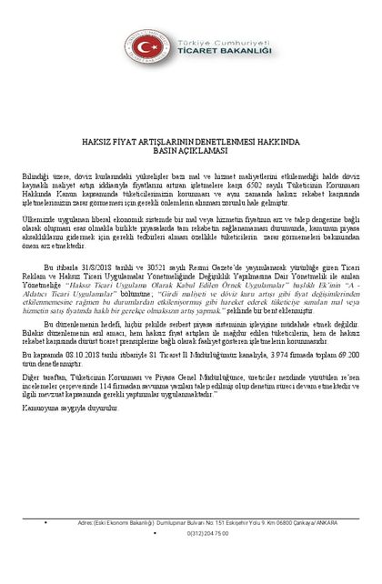 Ticaret Bakanlığı, haksız fiyat artışlarını denetlenmesine ilişkin basın açıklamasında bulundu. Açıklamada şu ifadeler kullanıldı: