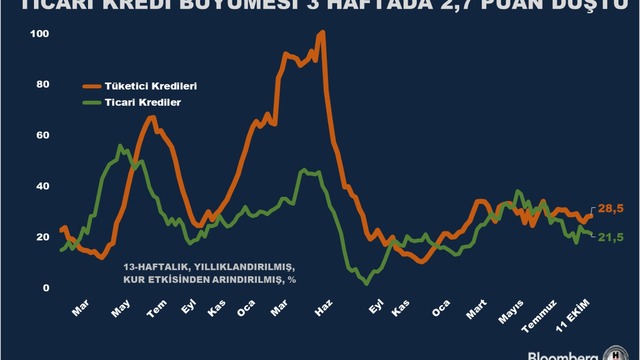 13 haftalık yıllıklandırılmış ve kur etkisinden arındırılmış büyüme ticari kredilerde 11 Ekim haftasında yüzde 21,5 olarak izlendi.