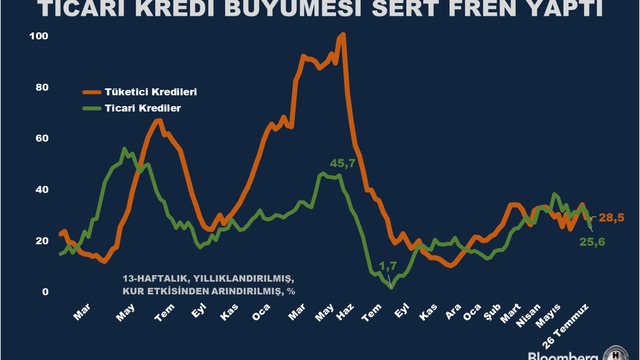 13 haftalık yıllıklandırılmış ve kur etkisinden arındırılmış büyüme 26 Temmuz haftasında ticari kredilerde yüzde 25,6 olurken, tüketici kredilerinde yüzde 28,5 olarak kaydedildi.