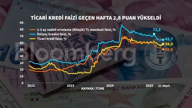 Bu dönemde bankalardaki 1-3 aylık mevduat faizleri yüzde 50 seviyesinde izlenirken, ticari kredi faizlerinde bir sıçrama görüldü. 21 Mart haftasında Ticari kredi faizleri bir haftada 2,8 puan artarak yüzde 58 seviyesine çıktı.