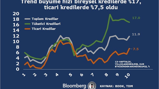 Bankacılık Düzenleme ve Denetleme Kurumu verilerine göre 1 Ekim haftasında 13 haftalık, yıllıklandırılmış ve kur etkisinden arındırılmış veri setine göre ticari kredilerde büyüme yüzde 7,5 oldu. Böylelikle ticari kredilerde son 5 ayın en hızlı büyümesi kaydedildi.