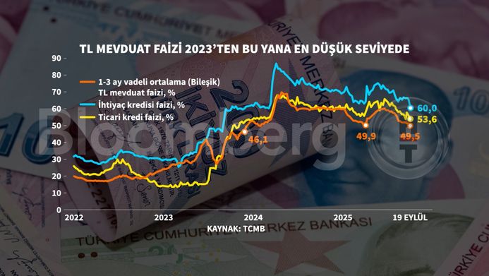 19 Eylül haftasında 1-3 ay vadeli ortalama bileşik TL mevduat faizi 50 puanın altına gerileyerek 2023 yılından bu yana görülen en düşük seviyesine indi. 1-3 ay vadeli TL mevduat faizi söz konusu haftada 49,5 olarak kaydedildi.