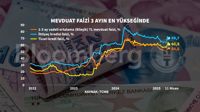 4 Nisan haftasında beş puanlık artış gösteren 1-3 ay vadeli ortalama bileşik TL mevduat faizi 11 Nisan haftasında da yüzde 54,6 seviyesi ile üç ayın en yüksek noktasını gördü.