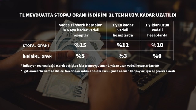 Türk Lirası mevduatları teşvik etmek için getirilen ve 31 Mayıs tarihi itibariyle son bulması öngörülen stopaj indirimi Haziran ve Temmuz aylarında da devam edecek.