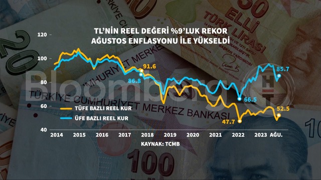TCMB'nin açıkladığı verilere göre TL'nin reel değeri açısından bir gösterge olan TÜFE bazlı reel efektif döviz kuru Ağustos'ta 52,50 olarak kaydedildi. Temmuz'da bu değer 48,70 seviyesindeydi.
