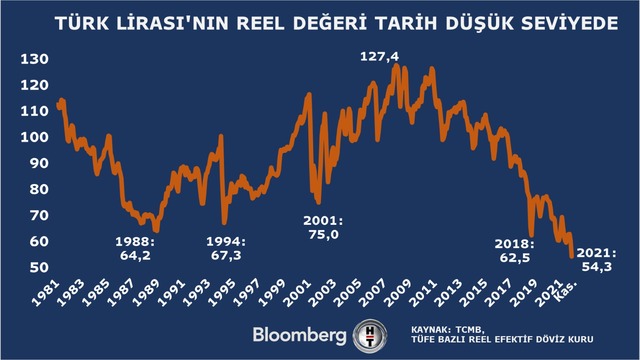 Türkiye Cumhuriyet Merkez Bankası (TCMB) verilerine göre Kasım'da TÜFE bazlı reel efektif döviz kuru 54,33'e geriledi. Böylece reel efektif döviz kuru 1994'e kadar giden veri setinde en düşük seviyeye gerilemiş oldu.