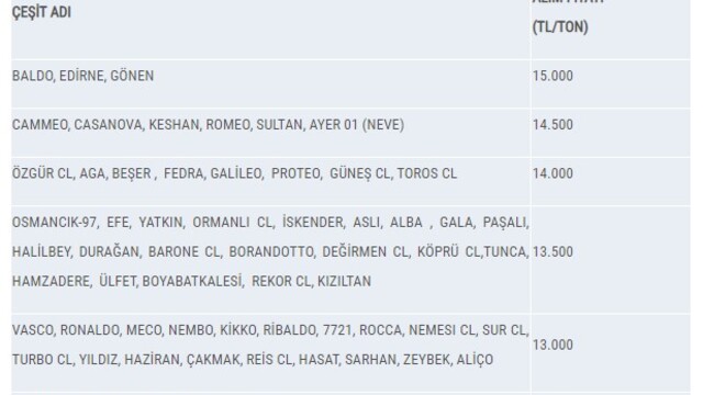 58 randıman Özgür grubu çeltikler için ton başına 14 bin TL, 60 randıman Osmancık grubu çeltikler için ton başına 13 bin 500 TL, 60 randıman Ronaldo-Vasco grubu çeltikler için ton başına 13 bin TL ve 65 randıman Luna grubu çeltikler için ton başına 12 bin 500 TL alım fiyatı açıklandı.