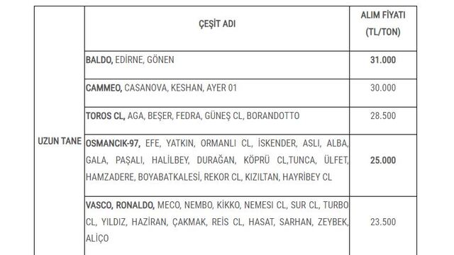 Tarım ve Orman Bakanlığının resmi X hesabından yapılan duyuruda, geçen yıl ton başına 24 bin TL olan 55 randıman Baldo grubu çeltiklerin alım fiyatı yüzde 29,2 artırılarak 31 bin TL olarak açıklandı.