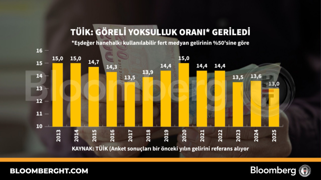 Bloomberg HT Grafik TÜİK: Göreli yoksulluk oranı geriledi TÜİK: Göreli yoksulluk oranı geriledi Giriş: 30 Aralık 2025, Salı 13:04 Güncelleme: 30 Aralık 2025, Salı 13:04