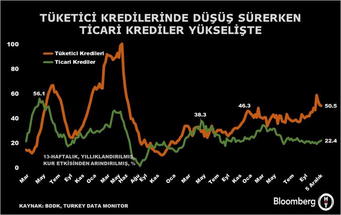 13 haftalık yıllıklandırılmış ve kur etkisinden arındırılmış büyüme ticari kredilerde 5 Aralık haftasında yüzde 22,4 ile hızlanma gösterdi.