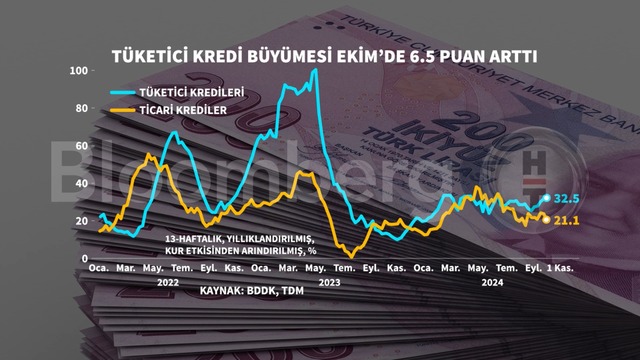 Tüketici kredilerinde ise büyüme biraz daha ivmelenmesini sürdürerek Ekim ayında 6,5 puan arttı. Tüketici kredilerinde büyüme yüzde 32,5 olarak olarak kaydedildi.