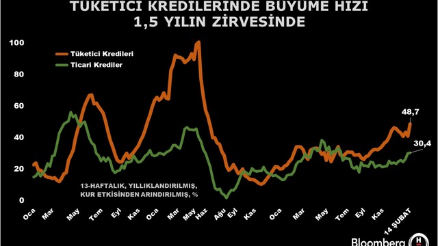 • Bankacılık Düzenleme ve Denetleme Kurumunun (BDDK) verilerine göre, 14 Şubat haftasında tüketici kredilerindeki büyüme hızlanarak yüzde 48,7 ile son 1,5 yılın zirvesine çıktı.