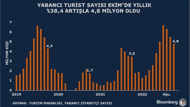 Kültür ve Turizm Bakanlığı Ekim ayına ilişkin yabancı turist girişlerini açıkladı. Ekim'de yıllık artış hızının düşmesi turizmde normalleşmeye işaret etti. Ocak-Ekim dönemine bakıldığında giriş sayısının önceki yıla göre neredeyse ikiye katlandığı izlendi.