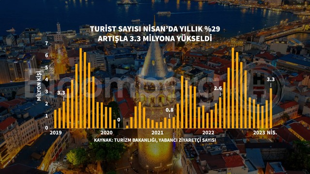 Kültür ve Turizm Bakanlığı verilerine göre, Türkiye 2023 yılının ilk 4 ayında toplam 11 milyon 93 bin 247 ziyaretçiyi ağırladı. Yabancı turist sayısındaki artış yüzde 29 olarak kaydedildi. Artışla 2019 yılı Nisan ayı verileri az da olsa aşılmış oldu.