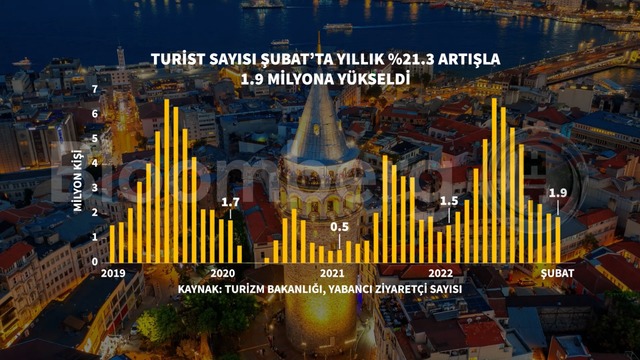 Kültür ve Turizm Bakanlığı verilerine göre Şubat ayında yabancı ziyaretçi sayısı bir önceki yılın aynı dönemine göre yüzde 21,4 arttı. Böylelikle yabancı ziyaretçi sayısında Şubat 2021'den bu yana en düşük artış görüldü. Ocak-Şubat döneminde artış ise yüzde 37 olarak kaydedildi.