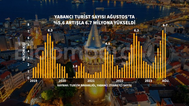 Türkiye 2023 yılının ilk 8 ayında toplam 36 milyon 754 bin 146 ziyaretçi ağırladı. Gelen ziyaretçilerin 33 milyon 426 bin 940'ını yabancılar, 3 milyon 327 bin 206'sını ise yurt dışı ikametli vatandaşlar oluşturdu.