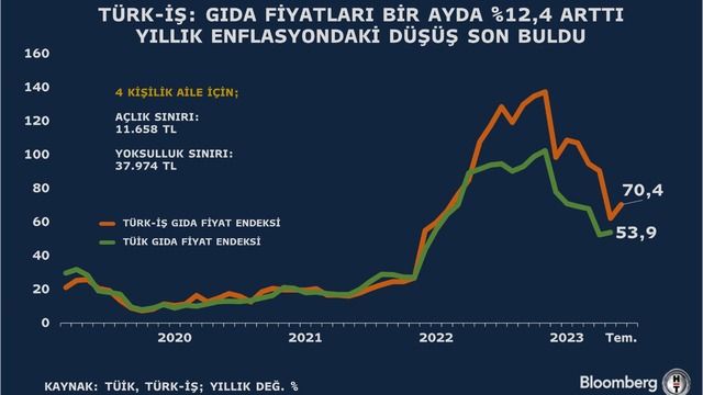 Türk-İş'in Temmuz ayına ilişkin açlık ve yoksulluk sınırı araştırmasına göre gıda enflasyonu aylık olarak yüzde 12,38 oldu. Böylelikle aylık gıda enflasyonunda Mayıs 2022'den bu yana en yüksek seviye kaydedildi.