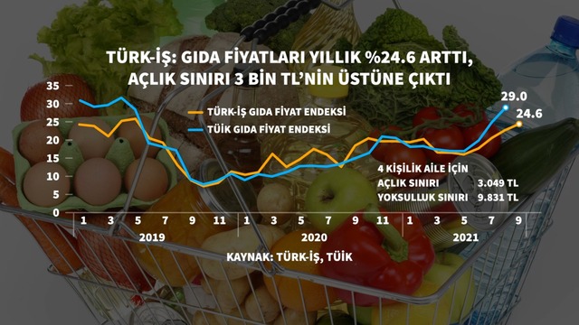Türkiye İşçi Sendikaları Konfederasyonu (Türk-İş), Ankara'da hesaplanan gıda enflasyonunun Eylül'de bir önceki aya göre yüzde 4,18 arttığını; dört kişilik bir ailenin açlık sınırının 3 bin 49 TL, yoksulluk sınırının ise 9 bin 932 TL'ye yükseldiğini açıkladı.