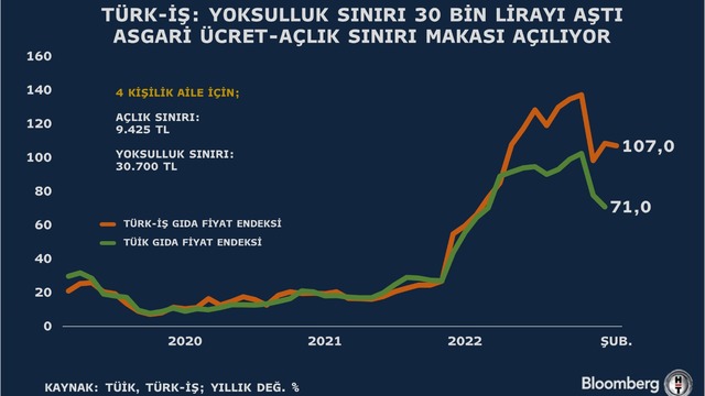 Türk-İş tarafından hazırlanan Açlık ve Yoksulluk Sınırı Şubat 2023 araştırmasına göre, dört kişilik bir ailenin sağlıklı, dengeli ve yeterli beslenebilmesi için yapması gereken aylık gıda harcaması tutarı (açlık sınırı) 9 bin 425,15 TL’ye yükseldi.