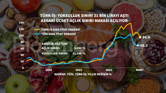 Türk-İş tarafından hazırlanan 'Açlık ve Yoksulluk Sınırı' araştırması gıda enflasyonunu aylık yüzde 1,76 arttığını ortaya koyarken açlık ve yoksulluk sınırı da yükseldi.