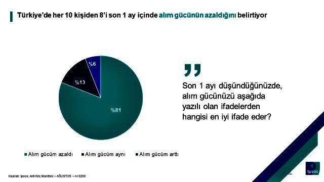 Türkiye'de son bir ay düşünüldüğünde alım gücünüzde nasıl bir seyir görüldü sorunsuna alım gücünün azaldığını söyleyenler yüzde 81, aynı kaldı diyenler yüzde 13 oldu.